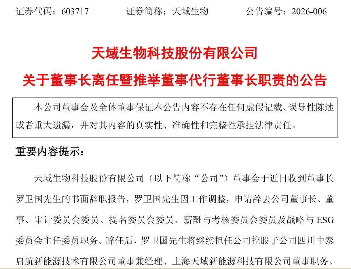 1月6日晚间,天域生物(603717.SH)公告,公司董事会于近日收到董事长罗卫国的书面辞职报告猎股网,罗卫国因工作调整,申请辞去公司董事长、董事、审计委员会委员、提名委员会委员、薪酬与考核委员会委员及战略与ESG委员会主任委员职务。